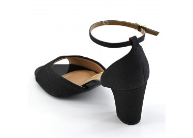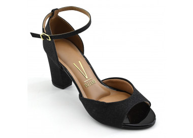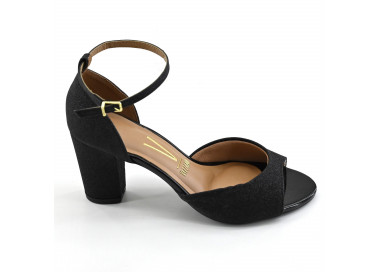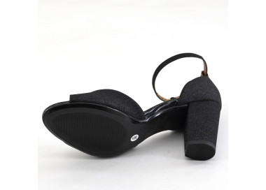 Sandalia de lurex con talonera. Acceso y ajuste mediante pulsera con hebilla. Fondo en suela sintética y taco forrado.