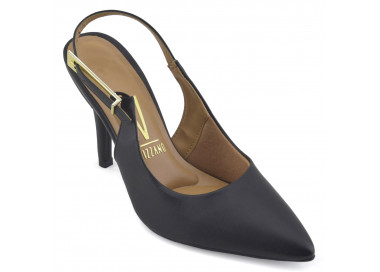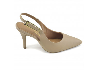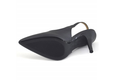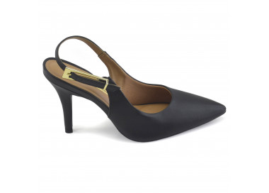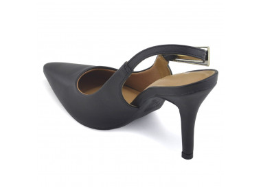 Stiletto de puntera cerrada y talón descubierto. Tira en talón con detalle de hebilla metálica. Fondo sintético con taco fino forrado y suelín sintético.