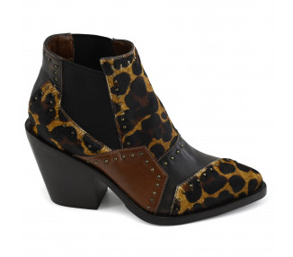 Texana corta en cuero y pelo combinado en piezas recorte superpuestas, con detalle de tachas en los bordes. Caña baja con piezas elastizadas en laterales. Fondo en suela con taco folia.