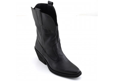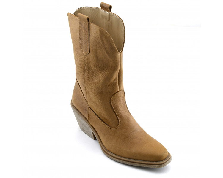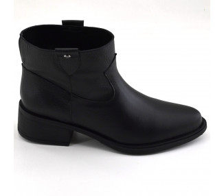 Texana de cuero con recortes. Caña media con cierre lateral. Suela sintética con taco folia.