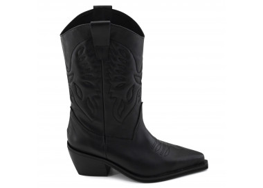 Texana en cuero con diseño labrado. Caña media alta con cierre lateral. Suela con taco folia.