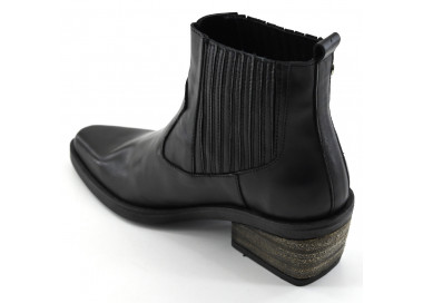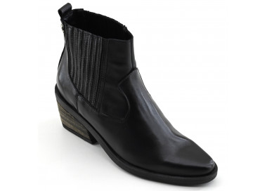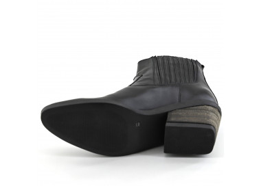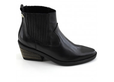 Texana de cuero liso con recorte superpuesto y dibujo bordado. Caña de acceso amplio con orejas de sujeción y cierre bajo en lateral interno. Suela con taco foliado y suelín sintético. Material: 100% Cuero / Taco: 5 cm / Caña: 27 cm.