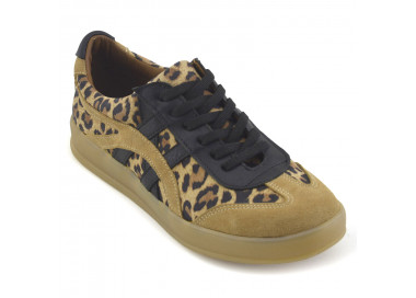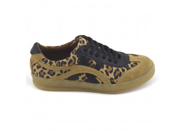 Zapatilla urbana de mujer en cuero y gamuza combinados. Acceso con cordones a tono. Base plataforma de goma.