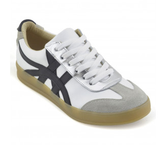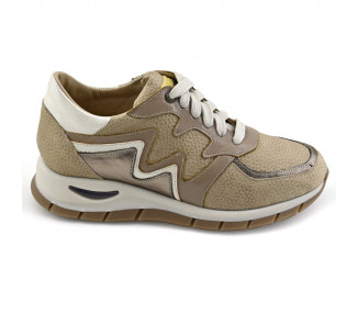 Zapatilla en cuero combinado de diferentes texturas y tonos. Cuero graneado, lustrado y metalizado.