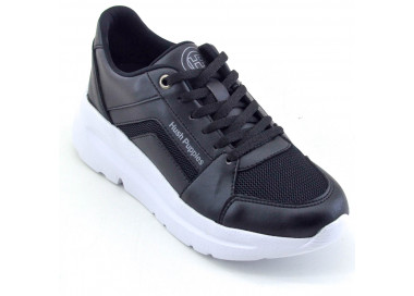 Fabricada en cuero vacuno y tela antidesgarro. Acordonada con ojalillos alpinos. Plantilla de latex y robusta suela plataforma de goma. Altura: 4 cm en plataforma y 5 cm en área de talón.