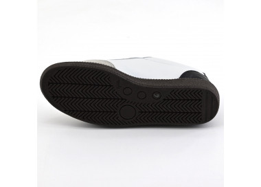 Confeccionada en material sintético con detalles en cuero descarne en la puntera, cartera y talón, presenta una altura de caña de 5,5 cm desde el talón.