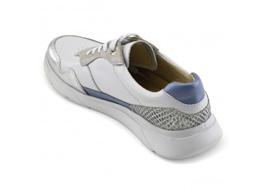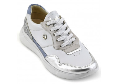 Zapatilla de mujer combinada en cuero y metalizado. Acceso con sistema de cordón y aplique de logo marca sobre lateral. Suela plataforma sintética.