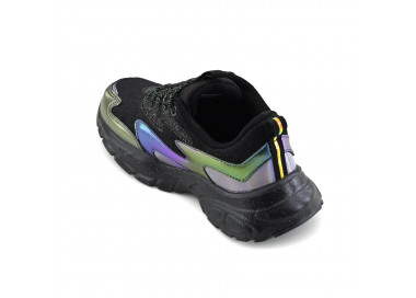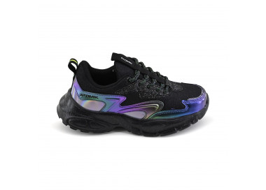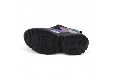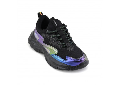 Confeccionada en textil y sintético con detalles en degrade y metalizados.