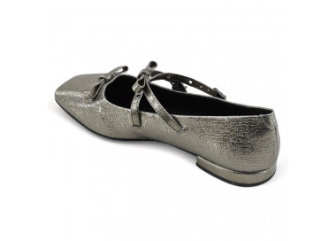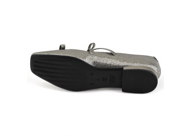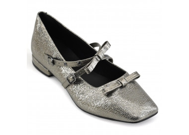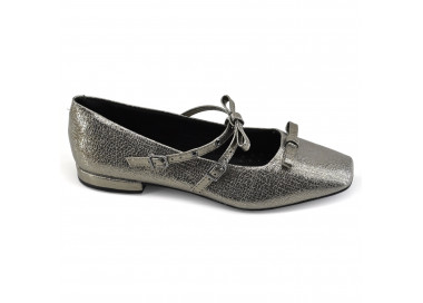 Zapato estilo ballerina en material charolado. Detalle tiras finas con apliques en formato de moños. Ajuste de tiras sobre empeine mediante hebillas laterales. Suela sintética con taco chato forrado y suelín sintético.