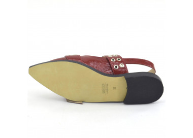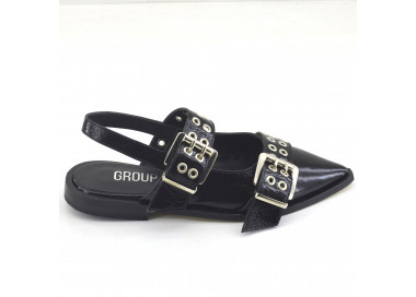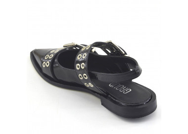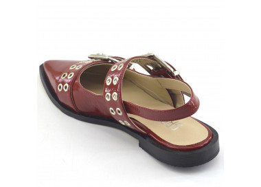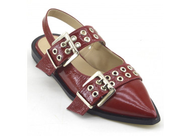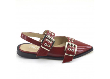 Zapato estilo balerina en cuero charolado. Tiras sobre empeine y en tobillo con hebilla. Suela con taco ultra chato.