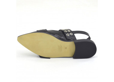 Zapato clásico de talón descubierto. Confeccionado en materiales sintéticos. Puntera y laterales cerrados con talón descubierto. Acceso y ajuste mediante tira con elástico detrás del talón. Taco cono forrado y base sintética.