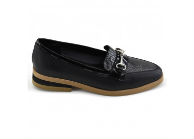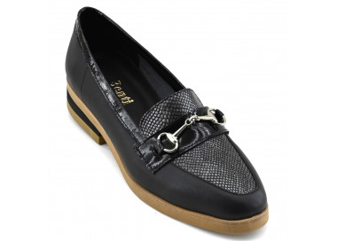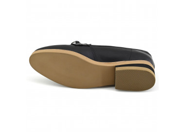 Zapato mocasin de cuero sintético. Detalle de flecos y aplique sobre empeine. Suela sintética con taco chato.