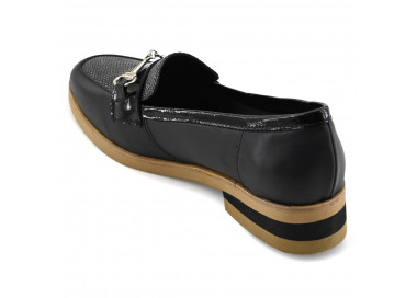 Zapato de charol sintético. Puntera cerrada y detalle de cinto con hebilla. Talonera con pulsera y hebilla. Base inyectada con taco forrado a tono.